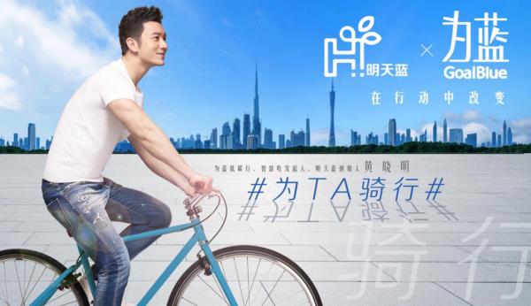 2017年3月31日,由公益组织“为蓝低碳发展促进中心”(简称GoalBlue为蓝)和黄晓明先生创立的公益环保项目“明天蓝”共同发起的#为TA骑行#公益活动正式启动。著名演员黄晓明先生将担任“为TA骑行”公益项目发起人。此次活动旨在呼吁更多人参与城市骑行,参与线上话题讨论,分享城市骑行故事,实践低碳环保生活方式。启动当日,发起人黄晓明也在微博定下了#为TA骑行#活动的第一个小目标,希望以微博话题互动的模式持续到4月22日地球日,在近30天内#为TA骑行#话题参与量突破百万,GoalBlue为蓝和明天蓝将携手黄晓明在内蒙古阿拉善腾格里沙漠锁边生态公益基地种植1万棵树苗,用于防沙治沙。